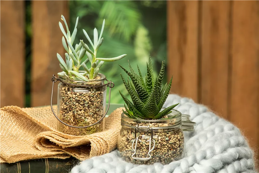 Sukkulenten in Granulat Wer bei der Raumgestaltung mit Kakteen und Sukkulenten arbeiten möchte, der sollte ihnen ein sonniges Plätzchen suchen. Denn das bevorzugen die meisten Arten und Sorten besonders. Zwar kommen sie auch im Halbschatten zurecht, aber ein Platz auf der Fensterbank in Richtung Süden ist immer sehr beliebt. Wo sich viele andere Pflanzen nicht wohlfühlen, baden Kakteen und Sukkulenten förmlich in der Sonne. Auch das Substrat ist entscheidend. Das sollte lieber nährstoffarm und trocken, als nass und nährstoffreich sein. Denn die kleinen Wüstenpflanzen haben sich an das karge Leben gewöhnt und machen dadurch besonders wenig Arbeit. Und im Urlaub? Da bekommt man definitiv kein Problem, denn bei der Raumgestaltung mit Kakteen und Sukkulenten muss man erst nach 4 bis 6 Wochen wieder zur Gießkanne greifen. Praktisch und hübsch zugleich, das sind Kakteen und Sukkulenten allemal.