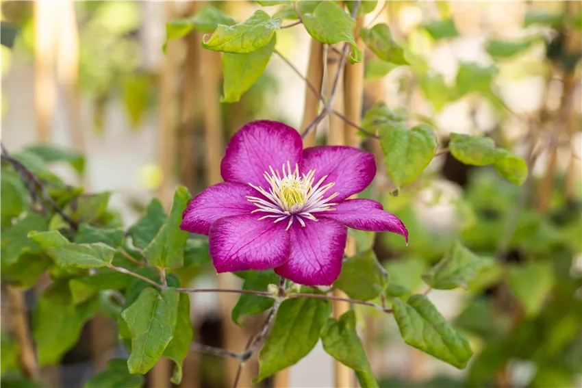 Clematis 'Ville de Lyon' Was wäre ein Garten ohne blühende Pflanzen? Und genauso wäre auch eine Mauer oder ein Spalier nur halb so schön, wenn keine Blüten im Spiel wären. Und zum Glück hat die Vielfalt der Kletterpflanzen nicht nur hübsche Blätter, sondern auch ganz besondere Blüten zu bieten. Das beste Beispiel sind Kletterrosen. Wer kennt nicht das Märchen mit der schlafenden Schönheit, die umgeben von Kletterrosen in einem Turm auf ihren Prinzen wartet? Wer sich dieses Märchengefühl in den eigenen Garten holen will, ist mit Kletterrosen genau richtig. Auch Clematis passen perfekt in die romantische Stimmung. Nicht umsonst gelten beide als kletterndes Dreamteam. Oder wie wäre es mit ein bisschen Exotik? In diesem Fall sind Passionsblumen ganz besondere Highlights und sorgen mit ihren extravaganten Blüten für Aufsehen. Und der Klassiker darf natürlich auch nicht fehlen: Kletterhortensien machen in jedem Garten eine gute Figur und sorgen für ländlichen Charme, der Gemütlichkeit ausstrahlt. Die Vielfalt der Kletterpflanzen ist nicht nur, aber vor allem im Bereich der Blüten nahezu unendlich.