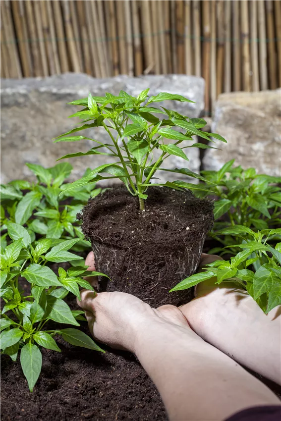 Capsicum annuum War die Anzucht erfolgreich, ist es nun an der Zeit, die Paprika in den Garten auszupflanzen. Wie bereits erwähnt, bevorzugt die Pflanze ein eher wärmeres Klima, weshalb man mit dem Einpflanzen im Beet warten sollte, bis die Temperaturen ansteigen. Ende Mai ist ein guter Zeitpunkt, um Frost garantiert zu umgehen. Wird die Paprika-Pflanze bereits vor Mai in den Außenbereich gesetzt, kann dies zur Folge haben, dass die Pflanze aufhört zu wachsen und keine richtigen Früchte bildet. Wer in kühleren Regionen wohnt, aber dennoch nicht auf den eigenen Anbau verzichten möchte, der kann alternativ die Paprika im Topf belassen und nur bei hochstehender Sonne nach draußen stellen. In der Nacht wird das Gemüse einfach zurück ins Warme geholt.