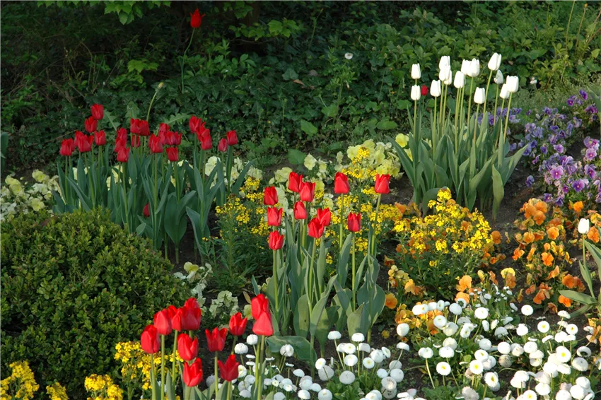 Beet mit Tulpen und Frühlingsblühern