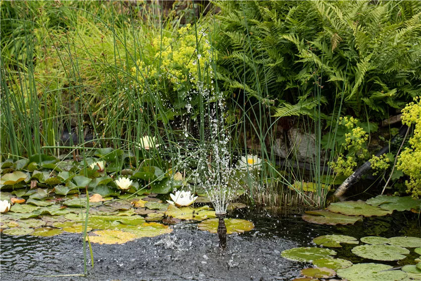 Wasserfontäne Natürlich mit Wasserpflanzen! Beim Gartenteich bepflanzen kommt es auf die feuchtigkeitsliebenden Pflanzen an, die sich an anderen Stellen im Garten nicht wohlfühlen würden. Dafür sollte man aber zuerst ermitteln, welche Wassertiefen im Teich vorhanden sind, denn die ist entscheidend für ein gesundes Wachstum der Pflanzen. Beim Gartenteich bepflanzen hat man oft vier Zonen: Die Tiefwasserzone beginnt ab ca. 40 Zentimetern. Die Flachwasserzone hat eine abfallende Tiefe von ca. 20 bis 50 Zentimetern und die Sumpfzone ist ca. 10 bis 30 Zentimeter tief. Die Zone am Teichrand wird als Uferzone bezeichnet und grenzt an den Gartenteich an. Je nach Pflanztiefe sollte man die richtigen Pflanzen auswählen und damit den Teich begrünen. Um die unterschiedlichen Teichzonen zu ermitteln, wird nachgemessen. Von der Oberkante der Teicherde oder der Pflanzkörbe, bis zur Wasseroberfläche. Ist die Wassertiefe ermittelt, gibt es für jede Zone im Teich die passenden Kandidaten zum Gartenteich bepflanzen. Und dabei ist eine Pflanze schöner, als die andere!