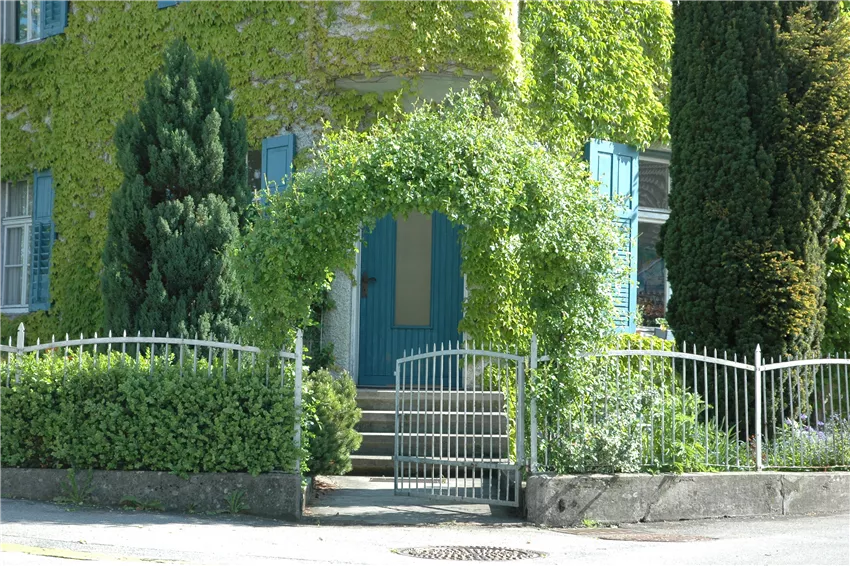 Hauseingang mit Kletterpflanzen Sollen schlingende oder rankende Kletterpflanzen als Sichtschutz Balkon oder Terrasse zieren, kommen meist einjährige Kletterpflanzen zum Einsatz. Prunkwinde, Duftwicke oder Sternwinde gedeihen sehr gut als Kübelpflanze und können sich an Trennwänden, Fassaden oder Spalieren hochranken und diese mit ihren farbenfrohen Blüten verschönern. Hierbei sind besonders große stabile und standfeste Pflanzgefäße empfehlenswert. Denn immerhin benötigen diese Kletterpflanzen als Sichtschutz in die Tiefe wachsende Pflanzenwurzeln, die ihnen den nötigen Halt geben müssen, damit sie ungehindert in die Höhe wachsen können. Schwere Kiesel- oder Pflastersteine, die auf den Boden des Pflanzkübels gelegt werden, können dem Pflanzgefäß zusätzliches Gewicht und damit Standfestigkeit verleihen. Außerdem sollte der Boden des Kübels mit einigen Löchern versehen sein, damit überschüssiges Wasser abfließen kann. Wer sich für mehrjährige Kletterpflanzen als Sichtschutz entscheidet, muss diesen einen geeigneten Winterschutz bieten, denn nicht alle mehrjährigen Kletterpflanzen sind frost- oder winterhart. Kübelpflanzen, die im Freien überwintern dürfen, werden mit Luftpolsterfolie oder Vlies verpackt und auf rollbare Untersätze oder Styroporplatten gesetzt, damit sie zusätzlich vor Bodenfrost geschützt sind.