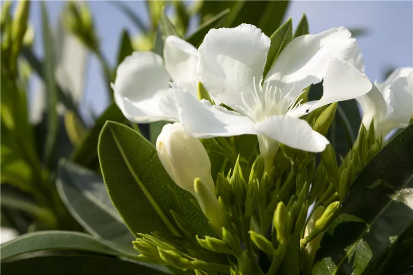 Nerium oleander, weiß Es gibt nicht viele Pflanzen, die das Gefühl von Urlaub so gut in den eigenen Garten, auf die Terrasse oder auf den Balkon bringen. Mediterrane Pflanzen haben da ganz klar die Blätter und Blüten vorne, denn sie bringen einen Hauch mediterranes Flair mit. Wer sich den sonnigen Süden einmal vorstellt, der denkt automatisch an die vielen Pflanzen, die charakteristisch für diese Gegend sind. Mit ein bisschen Fingerspitzengefühl und dem richtigen Know how kreiert man sich ein kleines Urlaubsparadies. Oleander, Olivenbaum und Zitrusbäume sind dabei ganz vorne mit dabei. Kein Wunder, ist allein schon ihr Anblick wie das Gefühl, im Urlaub auf der sonnigen Terrasse zu sitzen. Als Kübelpflanzen sind sie bestens geeignet und lassen sich ideal auf der Terrasse oder auf dem Balkon kultivieren. Nach den Eisheiligen haben sie ihren großen Auftritt und dürfen aus dem Winterquartier in die Sonne treten. Denn damit die mediterranen Schätze auch lange leben, brauchen sie im Winter, wenn es besonders kalt wird, ein frostfreies und geschütztes Winterquartier. Dort werden die mediterranen Pflanzen überwintert, bis sie dann endlich wieder den Sommer einläuten dürfen.
