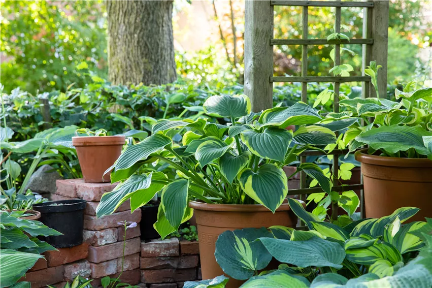 Gartenambiente mit Hosta Nach dem Funkien pflanzen kommt es auf die richtige Pflege an. Die ist zum Glück nicht sehr aufwendig, denn die Blattschmuckstauden sind nicht nur wunderschön, sie sind auch sehr robust und äußerst pflegeleicht. Die Stauden sind langlebig und werden von Jahr zu Jahr immer schöner im Wuchs und in den Blattmustern. Geteilt werden müssen die Stauden nur, wenn die Pflanzen zu groß geworden sind oder man die hübschen Blattschmuckstauden vermehren will. Dann geht es wieder ans Funkien pflanzen und man kann sich so den ganzen Garten mit den hübschen Stauden schmücken. Im Herbst vergilbt und verrottet das Laub der Pflanzen von allein, wird weich und zersetzt sich. Reste können im neuen Gartenjahr dann einfach abgezupft werden. Beim Funkien pflanzen im Topf ist wichtig, dass die Pflanzen regelmäßig und ausreichend gegossen werden, damit sie sich prächtig entwickeln.