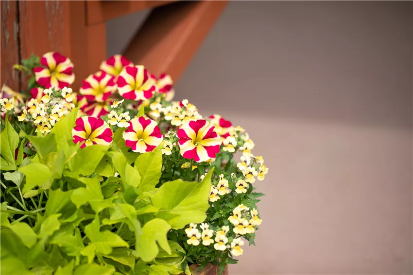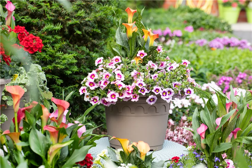Zantedeschia 'Patio Calla' Petunien sind besonders beliebt, wenn es um die Bepflanzung von Kübeln, Schalen und Balkonkästen geht. Ihr üppiger Wuchs und die vielen Blüten sind es, die sie bei Pflanzenliebhabern so beliebt machen. Dabei hat man die Wahl, wie die Blütenpflanzen eingesetzt werden sollen. Sowohl als Solitär als auch als Unterpflanzung machen die Blumen eine sehr gute Figur. Vor allem andere einjährige Sommerblüher sind es, die zusammen mit Petunien im Garten für gute Laune und farbenfrohe Akzente sorgen. Geeignete Nachbarn für die Petunie sind Geranien, Dahlien, Fuchsien, Lobelien und Tagetes. Aber auch Rosen und Wandelröschen sind die perfekten Nachbarn. Und nicht nur das: Petunien gehören zu den absoluten Klassikern im Bauerngarten. Daher machen sie auch neben frischen Kräutern und Gemüsepflanzen eine richtig gute Figur. In Trögen, Wannen oder Kisten kommt der rustikale Charme noch mehr zur Geltung und neben Blattschmuckpflanzen wie Buntnesseln oder Gundermann kommen die bunten Blüten noch besser zur Geltung. Der Sommer hat so viel zu bieten und Petunien sind mit ihren Blüten ganz vorne mit dabei!