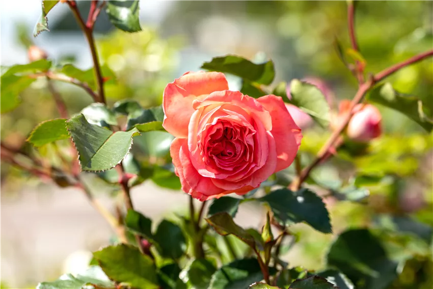 Strauchrose, apricot Ein Geheimrezept fürs richtige Rosen einpflanzen gibt es nicht, denn es kommt immer ganz darauf an, um was für eine Pflanze es sich handeln. Die Basiszutat ist aber ganz klar Wasser. Egal ob wurzelnackt oder im Topf – Rosen brauchen vor dem Einpflanzen immer Wasser. Dafür bietet es sich an, die Pflanze mit den Wurzeln in einen Eimer voll Wasser zu stellen. Wenn sich keine Blasen mehr bilden, hat sich die Pflanze und deren Wurzeln ausreichend mit Wasser vollgesogen. Generell gilt aber: je später im Jahr die Rose im Garten eingepflanzt wird, desto länger sollte sie gewässert werden. Wer also wirklich auf Nummer sicher gehen will, der wartet die Bläschen ab. Wurzelnackte Rosen bekommen nach dem Wässern einen Pflanzschnitt. Dafür werden die Rosen auf etwa 20cm gekürzt, wobei je Trieb mindestens 5 Knospen übrig bleiben sollten, damit die Rosen auch im Garten erstrahlen. Die Wurzeln werden ebenfalls etwas gekürzt. Das fördert die Bildung neuer Wurzeln und die Pflanze wächst schneller an. Ballenware wird nicht beschnitten, lediglich kranke oder abgestorbene Triebe werden entfernt.