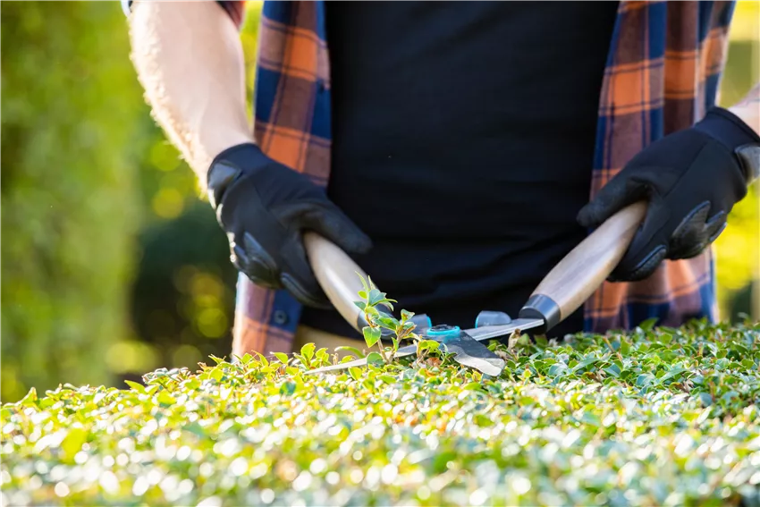 Gartengeräte - Mann mit Heckenschere Der perfekte Zeitpunkt für den Rückschnitt im Herbst liegt auf der Hand. Jetzt kann die Schere für einen frischen Look sorgen.