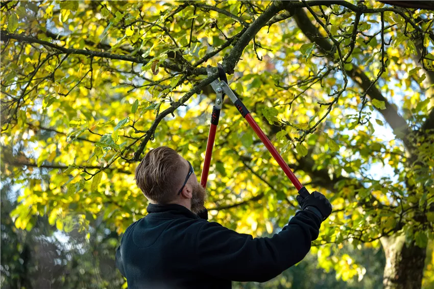 Gartengeräte - Mann mit Astschere Wichtig ist beim Rückschnitt im Herbst also die richtige Vorgehensweise. Aber wie sieht die aus? Grundsätzlich werden bei Bäumen und Sträuchern folgende Pflanzenteile und Äste geschnitten: Abgestorbene Äste und Zweige, die nicht nur unschön aussehen, sondern der Pflanze auch unnötig Energie rauben. Dünne Äste in der Nähe des Baumstammes werden ebenfalls geschnitten, damit der Baum oder der Strauch die Energie in die dickeren Äste stecken kann. Kranke Pflanzenteile und Äste sollten ebenfalls geschnitten werden, damit sich Keime und Krankheitserreger nicht auf die gesamte Pflanze ausbreiten. Dafür ist eine saubere Schere wichtig, damit beim Rückschnitt im Herbst nicht auch andere Pflanzen, die geschnitten werden, von den kranken Pflanzenteilen krank werden. Hier sollte man nach jedem Schnitt regelmäßig die Schere sterilisieren und dafür sorgen, dass die kranken Pflanzenteile direkt in der Biotonne und nicht auf dem Kompost entsorgt werden. Zu lang gewachsene Äste werden ebenfalls geschnitten, damit die Pflanze dicht und buschig wächst und keine Ausläufer bildet. Äste, die sich überschneiden oder gegeneinander reiben, werden ebenfalls beim Rückschnitt im Herbst entfernt. Damit bekommen die übrigen Äste wieder ausreichend Licht und können groß und stark werden.