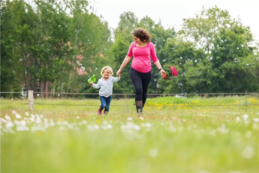Muttertag - Mutter und Kind auf Wiese Familien sollten bei der Gartengestaltung auch überlegen, wie sie ihn zu einem Spielparadies für Kinder machen können.