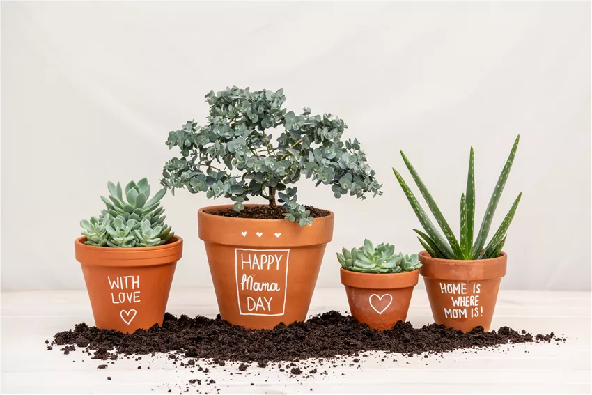 Muttertag - Bepflanzte Töpfe mit Aufschrift Einfach mal Danke sagen. Das geht am besten mit den passenden Blumen zum Muttertag. Und davon gibt es viele! Mit Blumen kann man manchmal mehr sagen, als 1000 Worte und trifft eigentlich immer den richtigen Ton. Vor allem aber zum Muttertag freuen sich die starken Mamas über eine kleine Aufmerksamkeit. Einfach mal ein bisschen Aufmerksamkeit zurückgeben, mehr wollen viele Mamas gar nicht.
