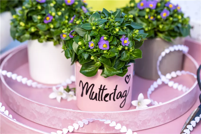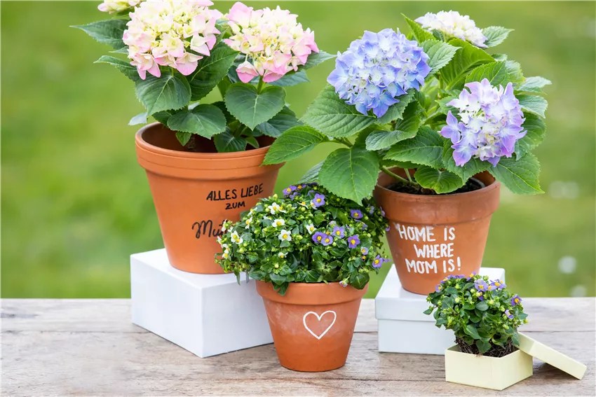 Muttertag - Bepflanzte Töpfe mit Aufschrift Blumen zum Muttertag haben eine lange Tradition. Kein Wunder, schließlich freuen wir uns alle über eine blumige kleine Aufmerksamkeit. Das kann ein frisch gepflückter Blumenstrauß vom Feld sein, aber auch ein professionell gebundener Strauß vom Floristen. Oder eine Topfblume, die beim Gärtner um die Ecke so gestrahlt hat. Für welche Blumen zum Muttertag man sich auch entscheidet, sie alle sind eine gute Idee und haben teilweise ganz besondere Bedeutungen. So drücken rote Rosen tiefe Liebe aus und symbolisieren damit auch die Verbindung zwischen Eltern und ihren Kindern. Rote Rosen sind nicht immer nur etwas für Verliebte! Auch Mama freut sich über die Königin der Blumen. Oder wie wäre es mit einer Hortensie? Seit vielen Jahren steht sie für Dankbarkeit und gerade die passt ja perfekt zum Muttertag. Ob als Strauß oder im Topf, Hortensien werden sehr gerne zum Muttertag verschenkt. Wer seiner geliebten Mama aber eine ganz besondere Aufmerksamkeit schenken will, der findet eine Iris. Sie steht für Glück, Hoffnung und Reichtum und wird mit Sicherheit die richtige Botschaft überbringen. Und für alle, die sich nicht entscheiden können: Es gibt noch so viel mehr Blumen zum Muttertag!