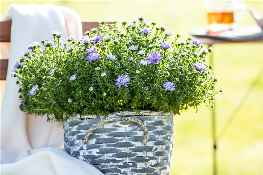 Aster dumosus, hellblau Im Herbst möchte man noch nicht auf üppige Blüten und sattes Grün verzichten. Bevor der trostlose, nasse und oftmals kalte Winter hereinbricht, kann man vor allem auf Balkonen mit Südlage die Sonne lange genießen und sich an den Balkonpflanzen im Herbst erfreuen. Ein Klassiker im Herbst ist die Herbstaster. Sie ist als Balkonpflanze im Herbst sehr beliebt, da sie üppig und farbenfroh blüht. Die Blütezeit beginnt im September und reicht bis in den November hinein. Es gibt verschiedenartige Züchtungen der Herbstaster, sodass man für den Balkon aus einem breiten Farbspektrum wählen kann. Ob lila, rosa, weiße oder purpurfarbene Blüten – je nach Geschmack können unterschiedliche Herbstastern kombiniert werden. Herbstastern haben keine großen Ansprüche an den Standort oder die Bodenbeschaffenheit.