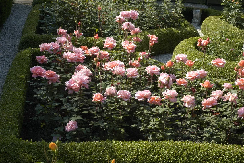 Wenn man sich vor allem an bunten Blüten erfreuen möchte, kann man den Schwerpunkt des Bauerngartens auch auf Zierpflanzen verlegen. Zur Wahl stehen zahlreiche Staudenarten, sowie Zwiebel- und Knollengewächse, die je nach Standort gepflanzt werden können. Typische Vertreter für den Bauerngarten sind vor allem Wicken, das Tränende Herz, die Kugeldistel und die Stockrose sowie Margeriten, Ringelblumen und Studentenblumen, die mit vielen bunten Blüten begeistern. Dabei dürfen auch Rosen in einem Bauerngarten nicht fehlen. Vor allem zusammen mit Stauden sind Beetrosen gut für Bauerngärten geeignet, während Kletterrosen den Eingang zum Garten umranken können. Zur Gestaltung des Rondells am Wegkreuz in der Mitte des Gartens werden Hochstammrosen zu einem besonderen Blickfang.