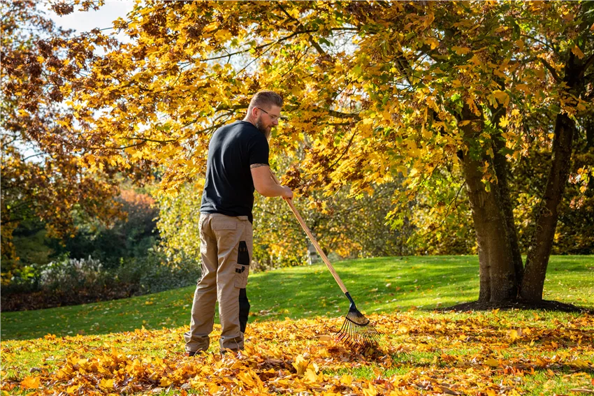Gartengeräte - Mann harkt Laub