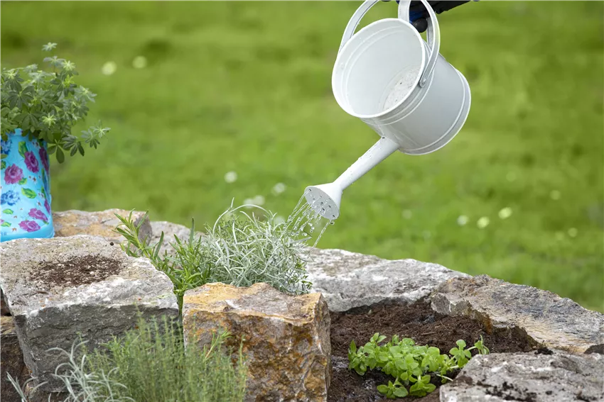 Kräuterbeet - Kräuter gießen Eine Kräuterspirale lässt sich in vier Zonen aufteilen. Die unterste Zone ist für Kräuter geeignet, die es feucht mögen und auch einmal nasse Füße vertragen können. In diese Zone sollte man eine Mischung aus 50 Prozent Gartenerde und 50 Prozent Kompost ausbringen. Hier fühlen sich Brunnenkresse und Wasserminze wohl. Die zweite Zone ist ebenfalls eine eher feuchte Zone, deren Substrat aus 50 Prozent Gartenerde, 20 Prozent Sand und 30 Prozent Kompost bestehen sollte. Sie ist ideal für Pflanzen wie Bärlauch, Estragon, Basilikum, Dill, Melisse, Petersilie und Liebstöckel. In der dritten Zone gedeihen die meisten Minzarten, Schnittlauch, Koriander, Kapuzinerkresse, Borretsch und ähnliche Kräuter am besten. Sie sollte mit einem Gemisch aus 50 Prozent Gartenerde, 30 Prozent Sand und 20 Prozent Kompost aufgefüllt werden. Der obere Bereich ist den mediterranen Kräutern vorbehalten, die es warm und trocken mögen. In der Erde aus 50 Prozent Gartenerde und 50 Prozent Sand gedeihen Currykraut, Lavendel, Oregano, Thymian, Rosmarin, die meisten Salbeiarten, Majoran, Lorbeer und weitere mediterrane Kräuter bestens.