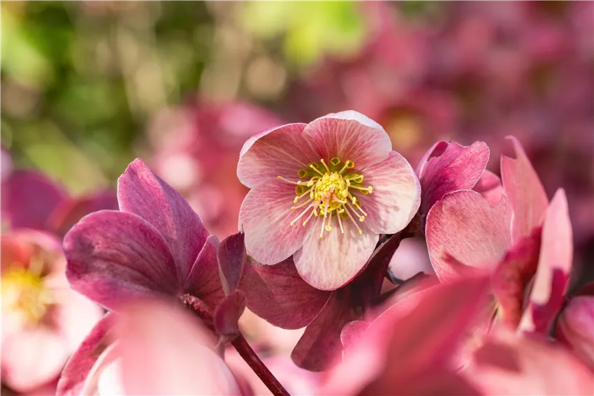 Helleborus Hybride 'HGC® Pink Frost' Die perfekte Nachbarschaft ist entscheidend für das eigene Wohlbefinden. Das ist auch bei Pflanzen so und für Christrosen sind die perfekten Nachbarn im Beet ebenso entscheidend. In erster Linie sind sie natürlich für sich selbst die besten Nachbarn, aber auch andere Pflanzen kommen neben den Stauden gut zur Geltung und umgekehrt. Vor allem mit Frühblühern entsteht ein harmonisches Bild, da die Pflanzen eine ähnliche Blütezeit haben. Winterlinge und Schneeglöckchen öffnen ihre Blüten kurz nach den Christrosen und blühen mit ihnen zusammen. Immergrüne Gräser sind ebenfalls gute Nachbarn, denn sie sind das ganze Jahr über ein Highlight. Seggen eignen sich für den bevorzugten Standort der Blütenstauden besonders gut. Auch das Vorfrühlings-Alpenveilchen ist ein guter Kandidat und stellt ähnliche Ansprüche an den Boden. Die passenden Nachbarn sollten den weißen Blüten der Christrosen aber niemals die Show stehlen.