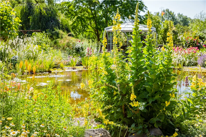 Verbascum densiflorum Wasserpflanzen im Garten zu integrieren, ist vor allem für die Teichbepflanzung wichtig. Denn diese besonderen Pflanzen haben Eigenschaften, die die Gesundheit und das Ökosystem im Teich im Gleichgewicht halten. Was aber passiert rund um den Teich? Einige Wasserpflanzen im Garten sind auch am Teichrand anzufinden, denn in der Sumpfzone fühlen sich einige der Kandidaten sehr wohl. Auch hier gibt es Stauden, die sich im feuchten Boden wohl fühlen. Dazu gehören vor allem Schnecken-Knöterich, Prachtspiere, Kugel-Primel und die Echte Schlüsselblume. Das sind nur ein paar der vielen Kandidaten, die am Teichrand für Aufsehen sorgen. Sumpf-Schwertlilie, Garten-Blut-Weiderich und Wald-Geißbart gehören ebenfalls dazu. Aber auch darüber hinaus sollte der Garten hübsch gestaltet werden, damit der Gartenteich nicht der einzige hübsche Fleck bleibt. Sommerstauden machen im Garten neben Wasserpflanzen eine sehr gute Figur. Damit wird der Teich im hübsch gestalteten Garten zum Highlight und man kann sich gerade an schönen Tagen ganz entspannt zurücklehnen.